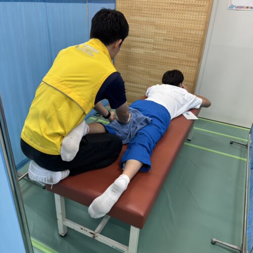 競技期間中、メディカルサポートトレーナーオープンブースの運営サポートを、高知学園大学の相澤徹教授と高知学園大学の学生と一緒に担当させていただきました。